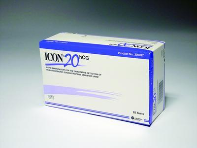 ICON* 20 hCG Test^ Rapid test for detecting hCG qualitatively, employing a solid-phase chromatographic immunoassay technology to selectively detect elevated levels of hCG in serum or urine. Detects hCG at 10 mIU/mL in serum and 20 mIU/mL in urine. Built-in positive and negative controls.