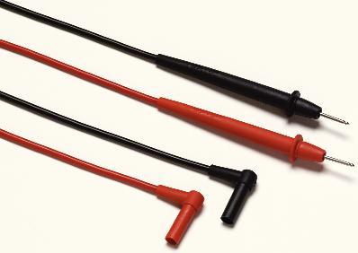 Hard Point Test Lead Set, Model TL75^ Leads are PVC insulated and feature wear-resistant alloy tips on one end. The other end features right-angled shrouded banana plugs. Set includes one black and one red test lead. CAT III rated for 1000V, 10A; CAT IV rated for 600V. Length: 1m.