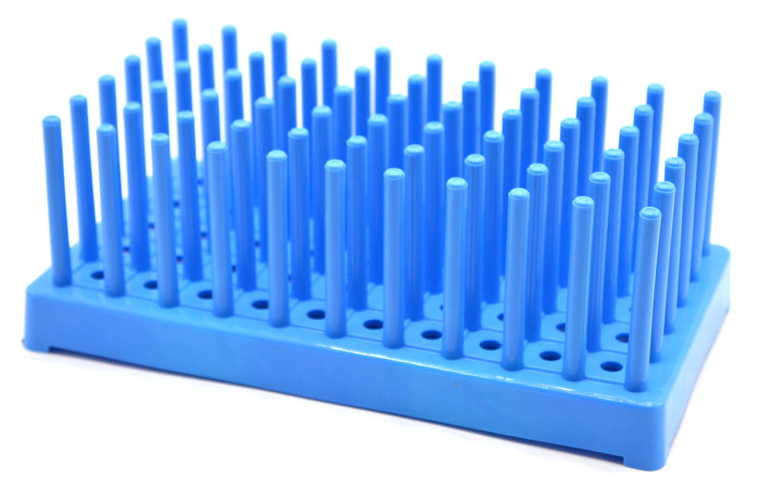 The test tube drying rack has 50 pegs to conveniently hold inverted test tubes (up to 16mm) for drying purposes, as well as to minimize the collection of airborne contaminants. The bottom of the rack has holes to increase air flow. In addition to test tubes, the drying rack can be used to hold and dry electrophoresis and chromatography plates.