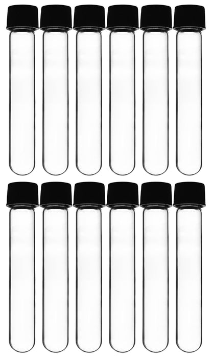 Pack of twelve, round bottom culture tubes, each with a 30ml capacity. Tubes are made of high quality Borosilicate 3.3 Glass, and include a Bakelite screw cap with rubber liner for a leak proof seal. Tubes are useful for a variety of laboratory applications including transferring and storing chemicals and samples, and for handling and culturing biological material. Also suitable for use in the home or garage for crafting and storage.The culture tubes are autoclavable and features superior chemical durability. Low temperature gradient, allowing them to withstand high temperatures & thermal shocks.Each culture tube measures 1" wide and 3.9" tall (including cap).Designed for use in professional laboratories, but is an ideal choice for science classrooms and household use.