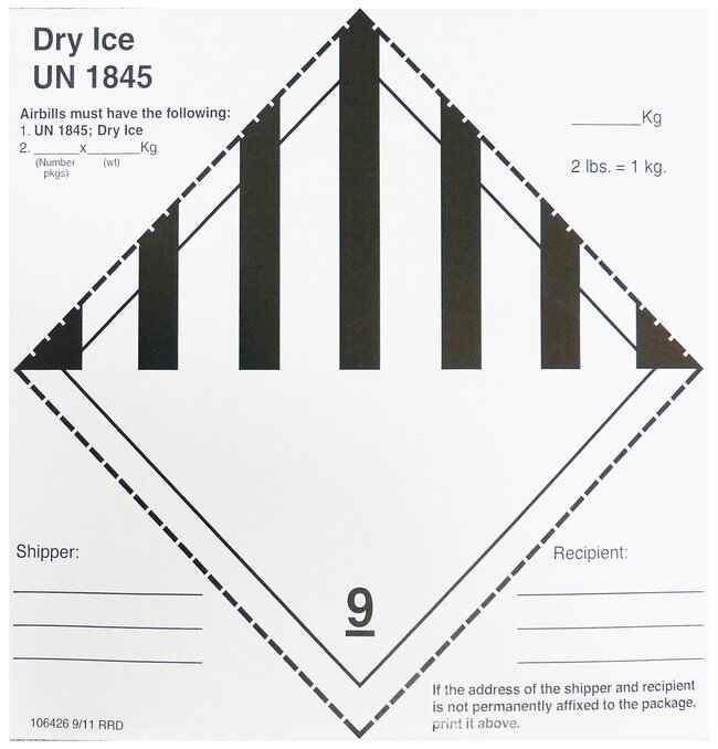 Self-adhesive roll stock for peel and apply conveniencePreprinted with all required information—simply complete designated Shipper and Consignee name and address, amount of dry ice (in kg) included in package, and apply label to packageComplianceComplies with DOT (49 CFR 173.217) and IATA (Packing Instructions 904) regulations.