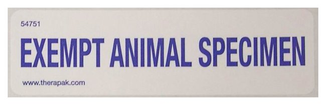 Exempt Animal Specimen category applies to shipment of animal specimens for which, through professional judgment, has been determined there is minimal likelihood that pathogens are present.Easy-to-use roll formatSimply apply the self-adhesive label to the exterior of complaint packaging prior to shipping500 labels per roll