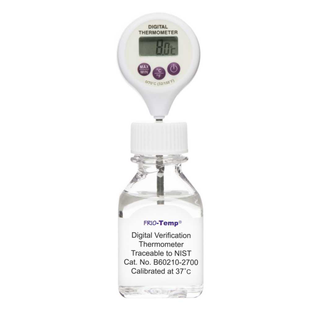 Frio-Temp* Thermometer 0/70 deg C^ Frio-Temp* Thermometer, Calibrated Electronic Verification Lollipop Stem, Calibration point: 37 deg C, Range: 0/70 deg C, Resolution: 0.1 deg C/deg F, Accuracy: /- 0.5 deg C, 60ml plastic bottle/organic liquid fill, 75mm Stainless steel probe