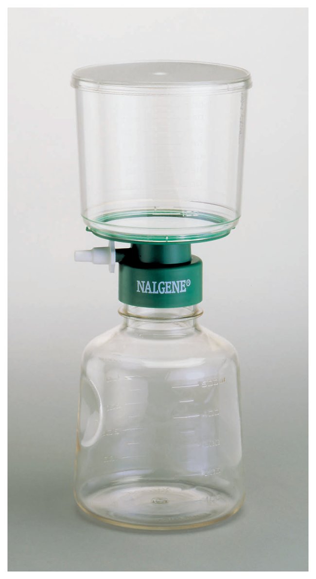 Graduated upper chamber with nonfiber-plugged side arm and quick-disconnect tubing adapter separates from graduated receiver for easy access to filtrateGamma radiation sterilized; nonpyrogenicTop and bottom chambers made of clear polystyreneCapacity: 500mLReceiver's ergonomic shape easy to grip and handleSterile, leakproof polyethylene closure lets you use the receiver for filtrate storagePore size, membrane type, catalog number, lot number and expiration printed on upper chamber of unitsThis product(s) resides on a Fisher Scientific GSA or VA contract. If you are viewing this page as a nonregistered user, the price(s) displayed is List Price. To view your GSA or VA contract pricing, log in using your account number, or become a registered user by contacting one of our Customer Service teams. You can also view your contract price by searching for this item(s) on GSA Advantage. To place an order, contact Fisher Scientific Customer Service.Order InfoIndividually wrapped. Sold in packs of 12 units and 12 glass fiber prefilters. Five-year sterile shelf life.