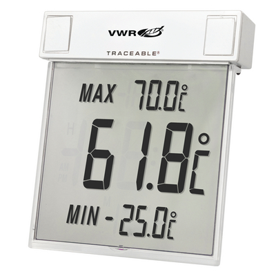 This digital thermometer can be used outdoors and in storerooms, fume hoods, labs, cleanrooms, refrigerators, and plant areas. It may be attached to the outside of a window to view outdoor temperatures. The thermometer features a transparent display with 3.2 cm (1 1/4") high digits that show current and minimum/maximum temperatures, which are automatically cleared and updated daily. The product comes with the following features: • Window or wall mount • Automatic minimum/maximum reset • Transparent display • Temperatures automatically cleared and updated daily A serial-numbered certificate is provided from an ISO 17025 calibration laboratory accredited by A2LA to indicate traceability to standards provided by the National Institute of Standards and Technology. The thermometer is supplied with mounting tape, pre-cut Velcro squares, and a AAA battery. VWR CATALYST provides convenient and efficient re-calibration services for your digital thermometers with an industry-leading 5-day average turnaround time from receipt of your instrument. All services will be performed by an ISO17025-certified lab. Recalibration, certification, and shipping fees are all included in the catalog number cost. Simply order the stated catalog number based on how many calibration points are desired. You will receive a protective box to ship your instrument to Avantor's certified calibration laboratory along with a work order form and a prepaid return shipping label. Upon receipt at the laboratory, your instrument will be inspected for any defects, and its performance will be compared to certified standards. After re-calibration, your calibration report and instrument will be carefully repacked and returned with standard ground shipping. Expedited service options are available upon request. Product specifications: • Temperature accuracy: ±1°C • Temperature resolution: 0.1° • Dimensions: 8.9 × 1.9 × 10.8 cm (3 1/2 × 3/4 × 4 1/4") • Weight: 227 g (8 oz.) • Catalog number: 36934-158 • Range: –25...70 °C