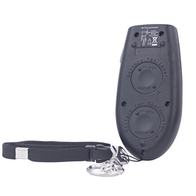 Here is the corrected text: Non-invasive, no-touch measurements make this thermometer ideal for food preparation, life sciences, pharmaceuticals, petroleum products, cleanrooms, electronics, and field use. Simple operation allows the unit to take readings in less than a second. The field of view is 6:1, allowing the thermometer to read a spot of 5 cm (2 inches) from 30.5 cm (12 inches) away. Emissivity ranges from 0.05 to 1.00 in 0.01 steps, covering most applications. A minimum/maximum feature allows viewing of the highest and lowest readings at any time. The laser beam permits perfect sample target sighting. This thermometer features a handy wristband and displays low battery warnings. The unit takes both Celsius and Fahrenheit readings of solids, semi-solids, and liquids. The hold function freezes the display at the current reading. Key features include Traceable certification, a laser beam pointer, readings in both Celsius and Fahrenheit, simple operation, and a memory feature that retains minimum/maximum readings. A serial-numbered certificate is provided from an ISO 17025 calibration laboratory accredited by A2LA to indicate traceability to standards provided by the National Institute of Standards and Technology. This thermometer comes supplied with a button cell battery. Specifications include: temperature accuracy of ±(2% + 1°C), temperature resolution of 0.1°C, dimensions of 10.2 × 5.1 × 2.8 cm (4 × 2 × 1.1 inches), weight of 63.8 g (2.3 oz.), and a range of –55...250 °C (–67...482 °F). The catalog number is 36934-176.
