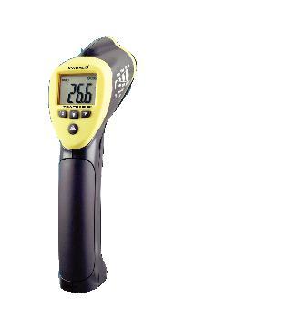 Here is the corrected text: Thermometer guns are ideal for food preparation, pharmaceuticals, field use, electronics, and safety inspections. They take instant (<1 second) temperature readings of any surface. Guns are available with fixed emissivity at 0.95 or adjustable emissivity from 0.10 to 1.00 in 0.01 steps. The adjustable emissivity gun (36934-182) features high/low alarms and memory for minimum, maximum, and average readings. The unique design permits one-handed "point-and-shoot" readings. A laser-sighting beam allows precise target surface aim. Features include backlighting, data hold (freezing the display reading), a low-battery indicator, and °C/°F buttons. The field of view is 50:1, indicating that the gun can read a spot size of 15.2 cm (6 inches) from 7.6 meters (25 feet) away. This product features Traceable certification, a 50:1 field of view, one-handed point-and-shoot readings, a backlit display, and the ability to freeze display readings to hold data. A serial-numbered certificate is provided from an ISO 17025 calibration laboratory accredited by A2LA, indicating traceability to standards provided by the National Institute of Standards and Technology. The thermometer gun is supplied with a 9V battery. Two models are available: Infrared Thermometer with Trigger Grip, Fixed Emissivity: - Temperature accuracy: ±(1.5% + 2°C) - Temperature resolution: 0.1° - Dimensions (W×D×H): 10.2×5.7×22.9 cm (4×2.1×9 inches) - Weight: 284 g (10 oz.) - Distance-to-spot ratio: 50:1 - Cat. No.: 36934-180 - Range: –50 to 1000 °C (–58 to 1832 °F) Infrared Thermometer with Trigger Grip, Adjustable Emissivity: - Temperature accuracy: ±(1.5% + 2°C) - Temperature resolution: 0.1° - Dimensions (W×D×H): 10.2×5.7×22.9 cm (4×2.1×9 inches) - Weight: 284 g (10 oz.) - Distance-to-spot ratio: 50:1 - Cat. No.: 36934-182 - Range: –50 to 1000 °C (–58 to 1832 °F)