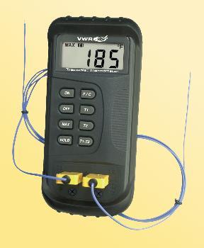 Here is the corrected text: The two-channel thermometer provides recessed front panel adjustable offsets on both channels, allowing for exact adjustment to a specific temperature or sensor for increased accuracy. The large 1.9 cm (3/4") display shows temperatures of the first probe, second probe, or the difference between the two probes. All Type-K probes can be used with liquids, air/gas, and semi-solids. The stainless steel probe with handle has a 15.9 cm (6 1/4") stem with a 3.3mm (1/8") diameter fitted to an 8.9 cm (3 1/2") handle. The beaded probe is 1.5mm (1/16") in diameter and features a 1.2m (4') fluoropolymer resin cable. The low-temperature stainless steel probe has a diameter of 4.3mm (3/16") and features a 30.5 cm (12") stem with a 12.7 cm (5") handle. The low-temperature probe is supplied with a 2.4m (8') expandable cable. The high-temperature probe features a 3m (10') braided metal wire cable with a smooth tip and measures 5mm (3/16") in diameter. The maximum button captures the highest reading achieved, while the hold button freezes the display to capture a current reading. The thermometer uses all Type-K thermocouples and features a built-in stand for lab bench use. The rubberized case protects from virtually all weather, shock, and abusive conditions. Key features include: * Traceable * 2-channel design * Reads °C and °F * Built-in stand A serial numbered certificate is provided from an ISO 17025 calibration laboratory accredited by A2LA to indicate thermometer traceability to standards provided by the National Institute of Standards and Technology. The thermometer is supplied with two fast-response Type-K beaded probes (61161-372), a 9V battery, and a Velcro fastener wrist strap. VWR CATALYST provides convenient and efficient re-calibration services for your digital thermometers with an industry-leading 5-day average turn-around time from receipt of your instrument. All service will be performed by an ISO17025 certified lab. Recalibration, certification, and shipping fees are all included in the catalog number cost. Simply order the stated catalog number based on how many calibration points are desired. You will receive a protective box to ship your instrument to Avantor's certified calibration laboratory along with a work order form and a prepaid return shipping label. Upon receipt at the laboratory, your instrument will be inspected for any defects, and the performance of your instrument will be compared to certified standards. After re-calibration, your calibration report and instrument will be carefully repacked then returned with standard ground shipping. Expedited service options are available upon request. Specifications: * Temperature Accuracy: ±(0.3% + 1°C) * Temperature Resolution: 1° * Dimensions: 70×133×32 mm (2 3/4 × 5 1/4 × 1 1/4") * Weight: 0.2 kg (0.3 lbs.) * Cat. No.: 77776-722 * Range: –50...1300 °C (–58...2372 °F) when used with appropriate probe