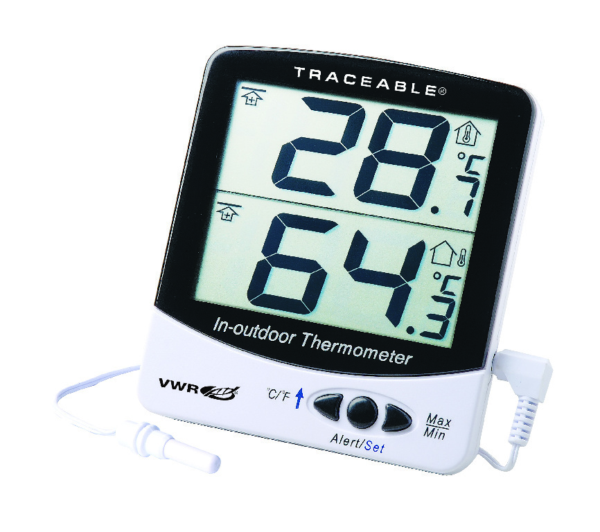 Jumbo digital display is easy to read from distances., NIST-traceable calibration also helps you meet quality standards and regulatory compliance for ISO, FDA, cGMP, VFC, CAP, CLIA and Joint Commission requirements., 02_BulletPoint: Get accurate, reliable measurements with included NIST-traceable calibration | F/°C selectable | Hi/Lo alarm, 08_Certifications: NIST-Traceable, 11_Delivery: Includes a probe, one AAA battery, and NIST-traceable calibration certificate with data., No. of Channels: 2 (Probe Channels), Temperature Range: 0...122 °F (0...50 °C); Probe: –58...158 °F (–50...70 °C), Jumbo digital display is easy to read from distances., NIST-traceable calibration also helps you meet quality standards and regulatory compliance for ISO, FDA, cGMP, VFC, CAP, CLIA and Joint Commission requirements., 02_BulletPoint: Get accurate, reliable measurements with included NIST-traceable calibration | F/°C selectable | Hi/Lo alarm, 08_Certifications: NIST-Traceable, 11_Delivery: Includes a probe, one AAA battery, and NIST-traceable calibration certificate with data., Traceable® Indoor/Outdoor Digital Thermometer with Giant Dual-Display and Calibration, Temperature Accuracy: ±2.0 °F (±1.0 °C), Temperature Resolution: 0.1 °C, Probe Cable Length: 120", Display: 1.25" Display, 3.5-digit LCD, Probe: Ø 0.125", Battery Type: AAA Battery (Included), Cat. No.: 76326-136