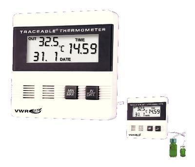 Here is the corrected text: Thermometers are ideal for monitoring solutions, refrigerators, and room temperature. The 1 cm (3/8") high LCD digits display the current, minimum, and maximum ambient or probe temperature, along with the exact time and date when they occurred. The sensor, which has a 182.9 cm (6') cable, performs accurately even when both are underwater. It features high-impact ABS housing. Thermometers with special bottle probes are specifically designed for refrigerator and freezer applications. Vaccine thermometers have a sensor probe that is sealed in a 5 mL bottle filled with GRAS nontoxic glycol. The bottle mimics vaccine temperature and fits in a vaccine tray. • Traceable • High-impact ABS housing • Fits in a vaccine tray • Highly visible LCD digits Thermometers fulfill all CDC thermometer and vaccine thermometer requirements. A serial-numbered certificate is provided from an ISO 17025 calibration laboratory accredited by A2LA, indicating instrument traceability to standards provided by the National Institute of Standards and Technology. Units are supplied with a sensor and cable, flip-open stand for bench use, slot for wall mounting, Velcro fastener to attach the thermometer to any surface, and AAA alkaline battery. VWR CATALYST provides convenient and efficient recalibration services for digital thermometers with an industry-leading 5-day average turnaround time from receipt of your instrument. All service will be performed by an ISO17025-certified lab. Recalibration, certification, and shipping fees are all included in the catalog number cost. Simply order the stated catalog number based on how many calibration points are desired. You will receive a protective box to ship your instrument to Avantor's certified calibration laboratory along with a work order form and a prepaid return shipping label. Upon receipt at the laboratory, your instrument will be inspected for any defects, and its performance will be compared to certified standards. After recalibration, your calibration report and instrument will be carefully repacked and returned with standard ground shipping. We also provide expedited service options available upon request. Temperature Range: –40 to 80°C (–40 to 176°F) Thermometer: • Temperature Accuracy: ±1.5°C • Temperature Resolution: 0.5°C • W×D×H: 90×90×24 mm (3 5/8 × 3 5/8 × 7/8") • Probe: 3.8L x 0.5 dia. cm (1 1/2 x 1/8") • Weight: 99.2 g (3.5 oz.) • Cat. No.: 62379-549 Vaccine Thermometer: • Temperature Accuracy: ±1.5°C • Temperature Resolution: 0.5°C • W×D×H: 90×90×24 mm (3 5/8 × 3 5/8 × 7/8") • Probe: 3.8L x 0.5 dia. cm (1 1/2 x 1/8") • Weight: 99.2 g (3.5 oz.) • Cat. No.: 89094-786 Thermometer with Bottle Probe: • Temperature Accuracy: ±1.5°C • Temperature Resolution: 0.5°C • W×D×H: 90×90×24 mm (3 5/8 × 3 5/8 × 7/8") • Probe: 3.8L x 0.5 dia. cm (1 1/2 x 1/8") • Weight: 99.2 g (3.5 oz.) • Cat. No.: 21800-076