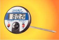 Here is the corrected text: Temperature Range: -50 to 150°C (-58 to 302°F) This digital dial thermometer fits cuvettes, test tubes, flasks, and beakers, reading temperatures in samples, reagents, water baths, foods, gases, and semi-solids. Readings update every second. The stainless steel probe is resistant to most laboratory chemicals. The dial has a 5.4 cm (2 1/8") diameter and features a large, bright 1 cm (3/8") high LCD display. Key Features: • Traceable • Wide temperature range • Easy-to-read LCD display • Reads in °C and °F Certifications: A serial-numbered certificate is provided from an ISO 17025 calibration laboratory accredited by A2LA, indicating instrument traceability to standards provided by the National Institute of Standards and Technology. Ordering Information: Supplied with a replaceable 1.5V silver-oxide battery. Product Specifications: • Digital Dial Thermometer • Length: 16.5 cm (6 1/2") • Temperature Resolution: 0.1° from -20 to 200°, 1° outside this range • Probe: 133 × 3.2 mm (5 1/4 × 1/8") • Cat. No.: 61161-310 and 77776-720 • Accuracy: ±1°C between -50 and 150°C, and ±0.3°C at 0°C and 50°C