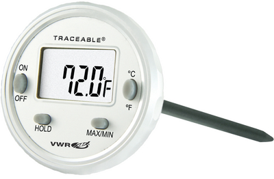 Temperature Range: –50.0° to 150.0°C (–58.0° to 302.0°F), Thermometer reports the maximum and minimum temperatures achieved during the dishwashing cycle., It insures proper cleaning by providing proof meeting the temperature regulation of achieving 180°F (82°C) during dishwashing, 04_BodyText: Records minimum/maximum reading. Features include °F/°C switch, minimum and maximum memory readings over any time period, and a HOLD switch (freezes the display to capture a temperature). Range is -58 to 302°F and -50 to 150°C, resolution 0.1°, and accuracy ±1°C between -20 to 150°C., 05_BodyText: Waterproof and metal construction are ideal for applications in wet labs, wash-down areas, and outdoors. Use it in food, pharmaceutical, clean rooms, and industrial labs. Stainless-steel probe, metal housing and sealed construction make it the most rugged thermometer ever designed for wet environments., 02_BulletPoint: Minimum/maximum memory readings | Waterproof | Stainless steel probe construction | Traceable, 08_Certifications: Traceable to NIST for accuracy. To assure accuracy an individually serial-numbered Traceable® Certificate is provided from VWR® ISO/IEC 17025:2005 calibration laboratory accredited by A2LA. It indicates traceability to standards provided by NIST (National Institute of Standards and Technology)., 10_Ordering: Supplied with silver-oxide battery, and a Traceable® Certificate., Thermometer with Dishwasher Clip, Temperature Accuracy: ± 1°C between -20°C and 150°C, Temperature Resolution: 0.1°, Ø×H: 1 | 3 | / | 4 × | | 3 | / | 4 | ", Weight: 1 oz., Cat. No.: 89204-738, Accuracy: ± 1°C, Temperature Range: –50.0° to 150.0°C (–58.0° to 302.0°F), Thermometer reports the maximum and minimum temperatures achieved during the dishwashing cycle., It insures proper cleaning by providing proof meeting the temperature regulation of achieving 180°F (82°C) during dishwashing, 04_BodyText: Records minimum/maximum reading. Features include °F/°C switch, minimum and maximum memory readings over any time period, and a HOLD switch (freezes the display to capture a temperature). Range is -58 to 302°F and -50 to 150°C, resolution 0.1°, and accuracy ±1°C between -20 to 150°C., 05_BodyText: Waterproof and metal construction are ideal for applications in wet labs, wash-down areas, and outdoors. Use it in food, pharmaceutical, clean rooms, and industrial labs. Stainless-steel probe, metal housing and sealed construction make it the most rugged thermometer ever designed for wet environments., 02_BulletPoint: Minimum/maximum memory readings | Waterproof | Stainless steel probe construction | Traceable, 08_Certifications: Traceable to NIST for accuracy. To assure accuracy an individually serial-numbered Traceable® Certificate is provided from VWR® ISO/IEC 17025:2005 calibration laboratory accredited by A2LA. It indicates traceability to standards provided by NIST (National Institute of Standards and Technology)., 10_Ordering: Supplied with silver-oxide battery, and a Traceable® Certificate., Thermometer with Stainless-Steel Probe, Temperature Accuracy: ± 1°C between -20°C and 150°C, Temperature Resolution: 0.1°, Ø×H: 1 | 3 | / | 4 × | | 3 | / | 4 | ", Weight: 1 oz., Cat. No.: 89204-740, Thermometer reports the maximum and minimum temperatures achieved during the dishwashing cycle., It insures proper cleaning by providing proof meeting the temperature regulation of achieving 180°F (82°C) during dishwashing, 04_BodyText: Records minimum/maximum reading. Features include °F/°C switch, minimum and maximum memory readings over any time period, and a HOLD switch (freezes the display to capture a temperature). Range is -58 to 302°F and -50 to 150°C, resolution 0.1°, and accuracy ±1°C between -20 to 150°C., 05_BodyText: Waterproof and metal construction are ideal for applications in wet labs, wash-down areas, and outdoors. Use it in food, pharmaceutical, clean rooms, and industrial labs. Stainless-steel probe, metal housing and sealed construction make it the most rugged thermometer ever designed for wet environments., 02_BulletPoint: Minimum/maximum memory readings | Waterproof | Stainless steel probe construction | Traceable, 08_Certifications: Traceable to NIST for accuracy. To assure accuracy an individually serial-numbered Traceable® Certificate is provided from VWR® ISO/IEC 17025:2005 calibration laboratory accredited by A2LA. It indicates traceability to standards provided by NIST (National Institute of Standards and Technology)., 10_Ordering: Supplied with silver-oxide battery, and a Traceable® Certificate.