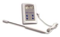 Here is the corrected text: Monitor temperatures of pharmaceuticals, vaccines, chemicals, blood and blood products, food products, and more with these high-accuracy digital thermometers featuring chemical-resistant probes. Features include minimum/maximum temperature readings and timers. All models come with accredited calibration documentation that meets ISO 17025 requirements. Tested and calibrated in an exclusive triple-accredited/registered ISO/IEC 17025:2005, A2LA-accredited laboratory (Cert #2448.01), against equipment whose calibration is traceable to NIST. The thermometer includes multi-language instructions (English, French, German, Italian, Portuguese, and Spanish). It is individually serialized, CE marked, and aligned with GLOBE protocols. Resolution: 0.1°C/°F Probe Cable Length: 1.5 m (4.9') coated Cat. No.: 82020-744 Dimensions: W×H: 63×97 mm (2.5×3.8") Calibration points: 0, 100 °C Accuracy: ±0.5 °C from -20/70 °C, ±1 °C from 70/120 °C, otherwise ±2 °C Probe: 125 mm (4.9") stainless steel Range: –50/200 °C (-58/392 °F) Battery Type: AAA