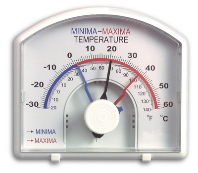 Durac* Thermometer^ Durac* Thermometer, H-B Instrument, Bi-Metal, Minimum/Maximum, Range: -30/60 deg C, Accuracy: 1 deg C/2 deg F, Divisions: 1 deg C/2 deg F, Dimensions: 7.9in W x 9.1in H, for use in high moisture or wet environments including green houses, sample prep areas