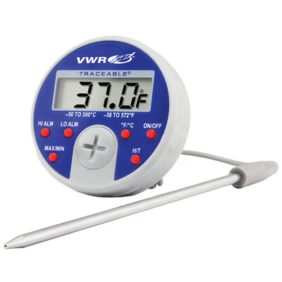 Here is the corrected text: Thermometers update readings every second and display them on a 1 cm (3/8") high LCD. The magnetic back allows for placement on metal surfaces, such as incubators, freezers, water baths, and more. The stainless steel probe features a 3m (10') long cable and piercing tip, enabling constant exposure to extreme temperatures at the end of the range. Thermometers also include a high/low alarm, minimum/maximum memories, and hold function. They are supplied with a 1.5V silver-oxide battery for 18 months of continuous use. Units also incorporate a flip-open easel for use on the lab bench and a spring fastener for clipping to any edge. These thermometers offer traceable readings in both °C and °F, with switchable temperature ranges from -50 to 300°C (-58 to 572°F). A serial-numbered certificate is provided from an ISO 17025 calibration laboratory accredited by A2LA, indicating instrument traceability to standards provided by the National Institute of Standards and Technology. Available models include: Cat. No.: 37000-430, Accuracy: ±1.0 °C, Range: -50 to 300°C (-58 to 572°F) Cat. No.: 37000-432, Accuracy: ±0.5 °C