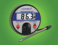 Here is the corrected text: Thermometers update readings every second and display them on a 1 cm (1/2") LCD readout. The magnetic back allows for placement on metal surfaces such as incubators, freezers, water baths, and more. The stainless steel probe features a 3m (10') long cable and piercing tip, allowing constant exposure to extreme temperatures at the end of the range. Units also incorporate a flip-open easel for use on the lab bench and a spring fastener for clipping to any edge. The dial depth is 1.4 cm (9/16") and the dial diameter is 5.4 cm (2 1/8"). These thermometers are Traceable and can read in both °C and °F, with switchable temperature ranges of -50 to 250°C and -58 to 500°F. A serial numbered certificate is provided from an ISO 17025 calibration laboratory accredited by A2LA, indicating instrument traceability to standards provided by the National Institute of Standards and Technology. The thermometer is supplied with a 1.5V silver-oxide battery for 18 months of continuous use. This full-scale thermometer has a temperature resolution of 0.1° from -20 to 200°C and 1° elsewhere. The probe measures 14L x 0.4dia cm (5 1/2" x 5/32"). The Cat. No. is 61161-328, with an accuracy of ±1.0 °C and a range of -50...+250°C / -58...+500°F.