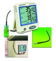 The sealed bottle sensor is insulated from rapid temperature changes when the refrigerator door is opened. The solution in the sealed bottle is generally recognized as safe by the FDA. The cable is easy for the refrigerator door to close and seal. The minimum/maximum feature displays the highest/lowest readings for any time period. An alarm sounds and flashes a bright red LED when the temperature rises above or falls below user-set trip points, which can be set in 0.1° increments. A unique 4-line display shows the temperature of the probe, ambient temperature, humidity, and time of day.