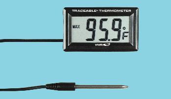 This versatile panel-mount module can be snapped into place or used as a stand-alone unit. It comes complete with a stainless steel probe featuring an extended 3m (10') cable with handle. The module records minimum and maximum memory readings over any time period. The easy-view, four-digit LCD measures 1.9 cm (3/4") high. • Traceable • Reads in °C and °F • Memory function stores minimum/maximum readings A serial numbered certificate is provided from an ISO 17025 calibration laboratory accredited by A2LA to indicate instrument traceability to standards provided by the National Institute of Standards and Technology. VWR CATALYST provides convenient and efficient re-calibration services for your digital thermometers with an industry-leading 5-day average turn-around time from receipt of your instrument. All service will be performed by an ISO17025 certified lab. Recalibration, certification, and shipping fees are all included in the catalog number cost. Simply order the stated catalog number based on how many calibration points are desired. You will receive a protective box to ship your instrument to Avantor's certified calibration laboratory along with a work order form and a prepaid return shipping label. Upon receipt at the laboratory, your instrument will be inspected for any defects, and the performance of your instrument will be compared to certified standards. After re-calibration, your calibration report and instrument will be carefully repacked then returned with standard ground shipping. We also provide expedited service options available upon request. Temperature Accuracy: ±1°C between –20 and 100°C Temperature Resolution: 0.1° from –20 to 200°, 1° elsewhere W×D×H: 6.2×1.3×3.8 cm (2 7/16 × 1 1/2 × 1 1/2") Probe: 3.2 mm dia. x 7 cm Long (1/8 x 2 3/4") Available catalog numbers and included features are: * 10171-280: ISO 17025 NIST Certification, Original Manufacturer Re-Calibration & no extra shipping fee * 10171-560: ISO 17025 NIST Certification, Customer-Specified 3-4 Points Re-Calibration & no extra shipping fee * 10171-444: ISO 17025 NIST Certification, Customer-Specified 1-2 Points Re-Calibration & no extra shipping fee * 77776-730: Range –50...300 °C (–58...572 °F)
