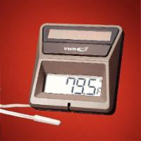 Here is the corrected text: Thermometers are always-on devices that run for years powered by light in the laboratory. Choose a thermometer with an internal sensor to monitor ambient temperature or one with an external 0.5 cm (3/16") diameter sensor and a 304.8 cm (10') long cable to monitor temperatures of liquids, air/gas, and semi-solids. Units sit on the bench and incorporate a slot for wall mounting. You can read temperatures in °F or °C at the flip of a switch. The 1.3 cm (1/2") LCD updates every 10 seconds and is readable from 10 feet away. The sensor and cable perform accurately even when submerged underwater. Features include: Traceable®, solar-powered, waterproof, and readings in both °C and °F. A serial-numbered certificate is provided from an ISO 17025 calibration laboratory accredited by A2LA to indicate instrument traceability to standards provided by the National Institute of Standards and Technology. Supplied with a Velcro fastener for attaching to any surface, solar panels, and a 1.5V silver-oxide backup battery for dim areas. Our VWR CATALYST™ service provides convenient and efficient re-calibration services for your digital thermometers with an industry-leading 5-day average turnaround time from receipt of your instrument. All services will be performed by an ISO17025-certified lab. Re-calibration, certification, and shipping fees are all included in the catalog number cost. Simply order the stated catalog number based on how many calibration points are desired. You will receive a protective box to ship your instrument to Avantor's certified calibration laboratory along with a work order form and a prepaid return shipping label. Upon receipt at the laboratory, your instrument will be inspected for any defects, and its performance will be compared to certified standards. After re-calibration, your calibration report and instrument will be carefully repacked and returned with standard ground shipping. Expedited service options are available upon request. The thermometer with an external sensor and cable has a temperature accuracy of ±1°, a temperature resolution of 0.1°, and dimensions of 70×70×19 mm (2 3/4 × 2 3/4 × 3/4"). The catalog number is 61161-334, and the range is –50 to 70°C (–58 to 158°F).