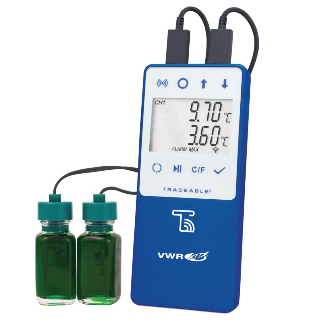 Resolution: T: 0.01 °C, Interface: WiFi, The simple, efficient, and reliable way to stay connected to your critical environments, wherever you go., Bottle probe: Temperature-buffered glycol bottle probe mimics solution-bottle and solution insulate sensor from rapid changes. Solution mimics temperature of stored samples. Probe is sealed in a miniature bottle (1×2⁻¹/₂") filled with nontoxic glycol. Solution is GRAS (Generally recognized as safe) by the FDA (Food and drug administration)., 04_BodyText: Bullet probe: Small sized plastic probe with cable 0.19" Ø×0.75" long. Designed for use in air and liquids, the sensor and cable may be completely immersed., 05_BodyText: Stainless-steel probe: Fast-response Stainless steel 316 probe displays the slightest temperature change instantly. Readings are updated three times a second. Accurate readings with tip penetration of 1". Probe has a diameter of 0.12", stem length of 6.25", an overall length of 9" and a cable length of 10'., 06_BodyText: Audible and visual alarms helps those present in the lab identify any out-of-range conditions. Ideal for use in healthcare and vaccine monitoring (VFC compliant). Works with any refrigerator or freezer. High-impact, chemical-resistant ABS plastic case., 07_BodyText: With TraceableLIVE®, stay connected to your lab with your smartphone, tablet, or personal computer. By simply using the TraceableLIVE® app, or visiting Traceablelive.com on any browser: view current environmental conditions, control alarm parameters, view datalogging history, view and generate reports. TraceableLIVE® Standard and Premium subscription plans are now available on website (https://us.vwr.com/store/product/35955573/traceablelive-subscription-coupon-codes-cole-parmer)., 02_BulletPoint: Monitor temperature and more locally or remotely | Alerts: temperature alarm, connectivity interruption, low battery | Cloud-based data interface | Continuous data transmission and monitoring using SSL encrypted SECURE connection | Receive MOBILE PUSH / E-MAIL / TEXT notifications | Multiple point temperature calibration—traceable to NIST | Unlimited scalability-use TraceableLIVE® in individual labs or an entire network | of facilities, 08_Certifications: CE marked. RoHS compliant. Traceable to NIST for accuracy. Multi-point calibration on an individually-numbered Traceable® certificate which assures accuracy from an ISO/IEC 17025:2005 (1750.01) calibration laboratory accredited by A2LA. It indicates traceability of measurements to the SI units through NIST or other recognized national measurement institutes (NMI) that are signatories to the CIPM mutual recognition agreement., 10_Ordering: Requires TraceableLIVE subscription. Units are supplied with 2 probes, quick start guide, batteries, wall mount, Velcro®, magnetic strips and an ISO 17025 Traceable® Certificate., 2 Bullet™ sensors, Weight: 6 oz., W×D×H: 108×70×19 mm (4.25×2.75×0.75"), Cat. No.: 10816-264, Accuracy: T: ±0.25 °C between −40.00... 60.00 °C, otherwise ±0.50 °C, Range: T: –50... 60 °C (–58... 140 °F), Resolution: T: 0.01 °C, Interface: WiFi, The simple, efficient, and reliable way to stay connected to your critical environments, wherever you go., Bottle probe: Temperature-buffered glycol bottle probe mimics solution-bottle and solution insulate sensor from rapid changes. Solution mimics temperature of stored samples. Probe is sealed in a miniature bottle (1×2⁻¹/₂") filled with nontoxic glycol. Solution is GRAS (Generally recognized as safe) by the FDA (Food and drug administration)., 04_BodyText: Bullet probe: Small sized plastic probe with cable 0.19" Ø×0.75" long. Designed for use in air and liquids, the sensor and cable may be completely immersed., 05_BodyText: Stainless-steel probe: Fast-response Stainless steel 316 probe displays the slightest temperature change instantly. Readings are updated three times a second. Accurate readings with tip penetration of 1". Probe has a diameter of 0.12", stem length of 6.25", an overall length of 9" and a cable length of 10'., 06_BodyText: Audible and visual alarms helps those present in the lab identify any out-of-range conditions. Ideal for use in healthcare and vaccine monitoring (VFC compliant). Works with any refrigerator or freezer. High-impact, chemical-resistant ABS plastic case., 07_BodyText: With TraceableLIVE®, stay connected to your lab with your smartphone, tablet, or personal computer. By simply using the TraceableLIVE® app, or visiting Traceablelive.com on any browser: view current environmental conditions, control alarm parameters, view datalogging history, view and generate reports. TraceableLIVE® Standard and Premium subscription plans are now available on website (https://us.vwr.com/store/product/35955573/traceablelive-subscription-coupon-codes-cole-parmer)., 02_BulletPoint: Monitor temperature and more locally or remotely | Alerts: temperature alarm, connectivity interruption, low battery | Cloud-based data interface | Continuous data transmission and monitoring using SSL encrypted SECURE connection | Receive MOBILE PUSH / E-MAIL / TEXT notifications | Multiple point temperature calibration—traceable to NIST | Unlimited scalability-use TraceableLIVE® in individual labs or an entire network | of facilities, 08_Certifications: CE marked. RoHS compliant. Traceable to NIST for accuracy. Multi-point calibration on an individually-numbered Traceable® certificate which assures accuracy from an ISO/IEC 17025:2005 (1750.01) calibration laboratory accredited by A2LA. It indicates traceability of measurements to the SI units through NIST or other recognized national measurement institutes (NMI) that are signatories to the CIPM mutual recognition agreement., 10_Ordering: Requires TraceableLIVE subscription. Units are supplied with 2 probes, quick start guide, batteries, wall mount, Velcro®, magnetic strips and an ISO 17025 Traceable® Certificate., 1 bottle sensor and 1 Bullet™ senso
