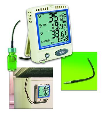 Sealed bottle sensors are insulated from rapid temperature changes when refrigerator doors are opened. The solution in the sealed bottle is generally recognized as safe by the FDA. The cable is easy for the refrigerator door to close and seal. The Minimum/Maximum feature displays the highest/lowest readings for any time period. An alarm sounds and flashes a bright red LED when the temperature rises above or falls below user-set trip points, which can be set in 0.1°C increments. A unique 4-line display shows the temperature of the probe, ambient temperature, humidity, and time of day.