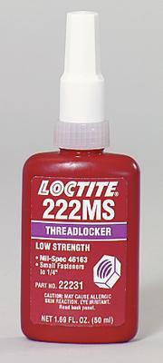 Threadlocker 222MS Small Fastener Adhesive^ Low-strength. Use with small fasteners up to 0.64cm in diameter and components requiring occasional adjustment. Protects threads from rust and corrosion. Removable with hand tools. 1200 to 6000cP, thixotropic. Color: purple. 50mL bottle.