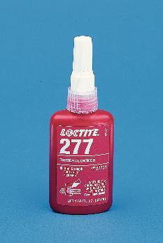 Threadlocker 277* Permanent-Grade Adhesive^ High-strength, high-viscosity grade for locking fasteners up to 3.8cm. Prevents loosening due to shock, heat, or vibration. Protects from rust and corrosion. Heating and hand tools are required to separate parts. Viscosity: 7000cP. Color: red. 50mL bottle.