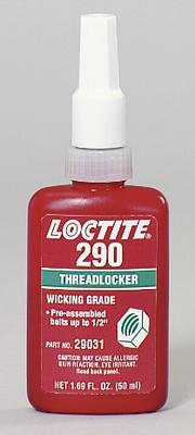 Threadlocker 290* Wicking-Grade Adhesive^ Medium-strength, low-viscosity for preassembled small to medium sized fasteners. Penetrates threads by capillary action to secure set screws and other assemblies. Viscosity: 12cP. Breakaway torque: 9.3N.m. Prevail torque: 28.2N.m. Color: green. 50mL bottle.