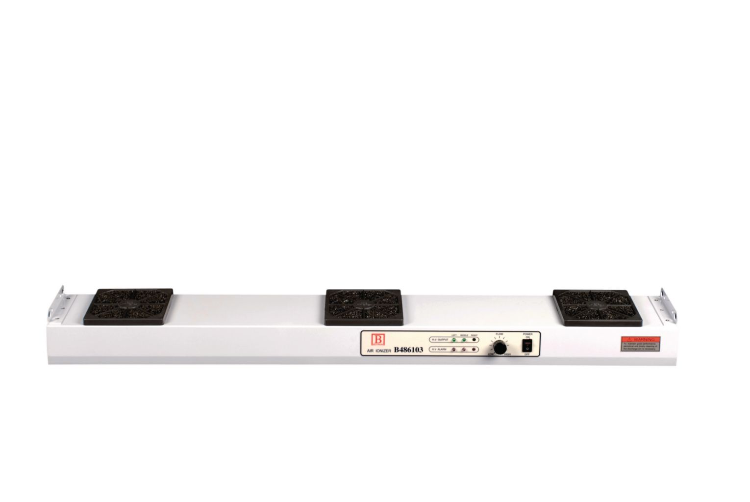 Air Ionizer Three Fan^ Air Ionizer, Three Fans, Airflow Adjusting Knob, Fan Guards, Green And Red Led Indicators, Ion Balance /- 5V, Decay Time At 18In /- 1000V Approx /- 100V <2.0 Seconds, Abnormal Hv Alarm, Air Flow: 210 - 360 Cfm, Air Volume: 12.8Ft - 32Ft / Min, Dimensions: 2.5Hx39.4Wx5.8Ind