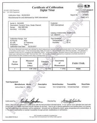 Here is the corrected text: Mounting options include laying flat on a bench, using the flip-open stand for a vertical view, carrying it on a lab coat with the convenient pocket clip, or using the magnetic back for metal surface attachment. This electronic timer features a Certificate of Calibration and an individual serial number, and has been tested and calibrated in H-B's exclusive triple-accredited/registered ISO/IEC 17025:2005, A2LA-accredited laboratory (Cert #2448.01), against equipment whose calibration is traceable to NIST. Key Features: • Clock feature • Last time set memory • Multiple mounting options Certifications: • CE marked • RoHS compliant Ordering Information: Requires one LR44 battery (included). Product Specifications: • Cat. No.: 82023-858 • Dimensions: 70 × 51 mm (2.8 × 2") • Accuracy: ±3 s • Timer: 23 h, 59 min, 59 s