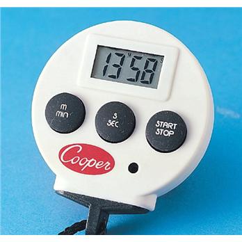 Display 7/8 " x 3/8 " to 00.00Press “min” and “set” together to resetPress “start/stop” to start and again to stopPress any key to stop alarm“Recall” feature returns automatically to preset timeDisplays up to 99 minutes and 99 seconds. Counts up and down. Alarm rings until turned off. Supplied with one Energizer A76 watch-type battery and 18 " nylon neck rope. Unit dimensions: 2.25 " diameter.