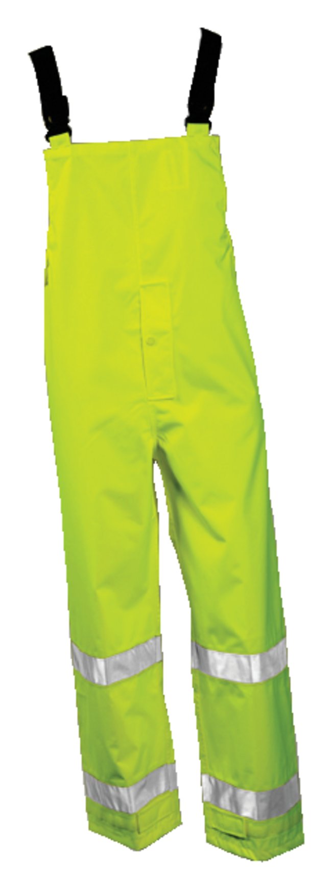 For use in environments where high visibility is desiredConstructed of breathable, 12mil thick polyurethane on 300 denier woven polyesterStitched and taped sealed seams provide 100% waterproof protection2 in. (5cm) reflective tape reflects for 360° nighttime conspicuityMesh/taffeta lining provides added comfortVelcro™ take-up straps on ankle cuffs provide adjustable fitZipper/storm fly front with throat guards seals out wind and rainFluorescent yellow/greenBib overalls: heavy-duty suspenders with quick-release buckles and crossover, take up snaps on waist for adjustable fit, and snap-fly frontOveralls are Class E compliantComplianceMeets ANSI™/ISEA 107-2010 standards; Class 3 compliant. Overalls are Class E compliant.