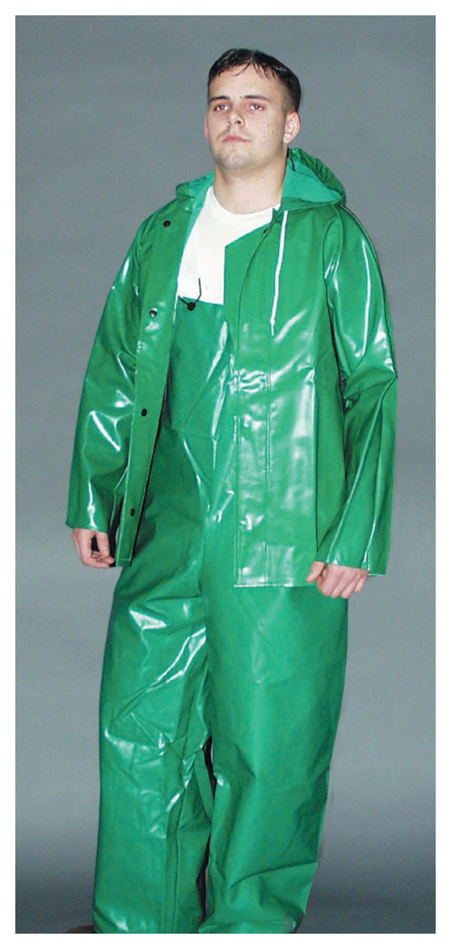 Heavy exterior coating for excellent permeation performance; resists many acids, oils, alcohols, salts and alkalisLight interior coating protects fabric from chemical contaminationAll seams are Therm-O-Rad sealed—no needle holes for chemicals to penetrateDouble-coated PVC on stretch circular polyester knit fabric offers exceptional protection Full cut shoulder with 90° sleeve to body angle provide maximum freedom of movement; tapered to fit in protective gloves or accommodate glove rings for added safetyJacket also features storm fly front, hidden hardware, and self-material collar Overall has plain front with premium snap-lock suspender bucklesNonconductive, noncorrosive snaps and bucklesDistinctive safety green color for easy identificationFlame and mildew resistantGarments are flame resistant, not flame retardant. Self extinguishing with flameout and afterglow less than two seconds after removal of ignition source (Test Method ASTM D6413-99).
