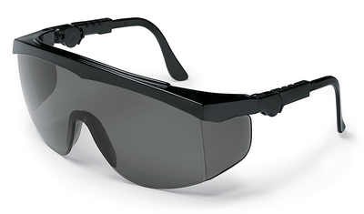Safety Glasses^ Tomahawk* safety glasses with black frames and grey lenses.