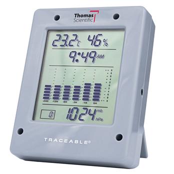 Specifications Digital Barometer is the perfect unit for plants, labs, and all other environments where there is a need to monitor conditions of environmental air parameters. Traceable® Digital Barometers have a four-line LCD that continuously and simultaneously shows barometric pressure, temperature, relative humidity, barometric pressure trend and time-of-day. Traceable® Digital Barometers have minimummaximum readings for barometric pressure, temperature and relative humidity are stored every hour for the last 24 hours and are available for recall at the touch of a button.Measuring Ranges Barometric pressure range from 500 to 1030 millibars (mbar) with a resolution of 1 mbar. Accuracy is ±4 mbar. Barometric pressure trend shows in bar-chart format the current and past 1-, 3-, 6-, 12-, and 24-hour readings. Switching permits viewing in millibars (mbar), inches of mercury (inHg), or hectopascals (hPa). Altitude compensation is –100 to 2500 meters.Temperature range is 32 to 131ºF and 0 to 55ºC. Resolution is 0.1° and accuracy is ±0.4°C. Relative humidity range is 0 to 95%. Resolution is 1% RH and accuracy is ±3% RH between 5 to 75%, otherwise ±5% RH.Computer output allows unit to be connected to a computer using the accessory Computer Data Acquisition System to permanently capture readings.Traceable to NIST for accuracy An individually-numbered Traceable® Certificate is provided which assures accuracy from our ISO/IEC 17025:2005 calibration laboratory accredited by A2LA. It indicates traceability to standards provided by NIST (National Institute of Standards and Technology). Supplied: Traceable® Certificate, wall mount, flip open stand and batteries. Size: 4 x 3 x 1 inches. Weight: 7 ounces.Please note: The aforementioned A2LA accreditation belongs to the manufacturer, not Thomas Scientific.Cole-Parmer item number6800049Max Humidity RH (Inside) (%)95Max Temperature (Inside) (° C)55Max Temperature (Inside) (° F)131Max Barometric Pressure (PSI)14.94Humidity Accuracy (Inside)±3% (5 to 75%), otherwise ±5%Height (in)3Height (cm)7.6Depth (in)1Depth (cm)2.5Data LoggingStream live data to PC with 68000-51 Data Acquisition SoftwareBattery TypeThree AAA (included)Barometric Pressure Resolution (PSI)0.1 Hg (1 mbar)Barometric Pressure Accuracy (PSI)±0.12 " Hg (4 mbar)Temperature Resolution (Inside) (° F)0.1