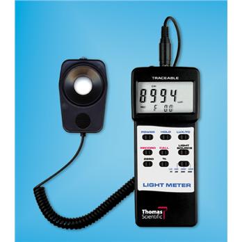 Dual displays show lux or foot-candles, or percent differential from a reference point, and the selected light source (daylight, tungsten, fluorescent, or mercury). Traceable® light meter has computer output that allows it to be connected to a computer or data logger for monitoring and keeping results. To assure accuracy an individually serial-numbered Traceable® Certificate is provided from our ISO 17025 calibration laboratory accredited by A2LA. It indicates traceability to standards provided by NIST (National Institute of Standards and Technology).Readings in lux and foot-candlesDual-Display Meter measures lux in three ranges: 0 to 1999 (1 lux resolution), 2000 to 19,990 (10 lux resolution), and 20,000 to 50,000 (100 lux resolution). Readings in foot-candles: 0 to 199.9 (0.1 Fc resolution), 200 to 1,999 (1 Fc resolution), 2,000 to 5,000 (10 Fc resolution). For accuracy see chart. Unit has zero reference settings for all light sources.Unit recalls highest, lowest, and average readings at the touch of a button. DATA HOLD button freezes the display to capture readings. Precise photodiode and color-correction filter provide cosine- and color-corrected measurements.Jumbo-sized digits are 1-3/8 inches high. Unit is supplied with 2 inch diameter photocell (cable length is 40 inches), Traceable® Certificate, 9-volt alkaline battery, and computer output. Probe specification is 2-inch diameter photo cell/40-inch cable length. Size is 7 x 3 x 1-1/4 inches. Weight is 9-1/2 ounces.Please note: The aforementioned A2LA accreditation belongs to the manufacturer, not Thomas Scientific.