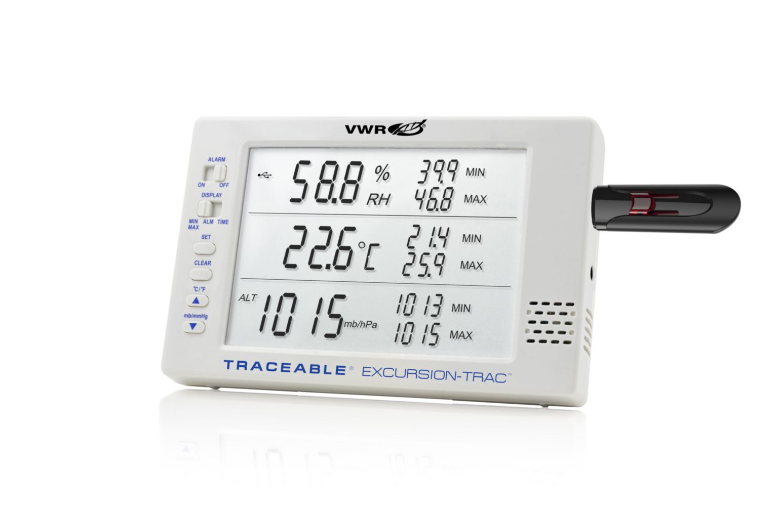 Resolution: T: 0.1 °C | RH: 0.1% | P: 1 mbar, Interface: USB, Simultaneously monitor barometric pressure, temperature, and humidity., Hi/Lo alarms and time/date stamps: Unique alarm settings can be programmed for all three parameters. Alarm tracking feature stores in memory each alarm event, detailing when the alarm state occurred, as well as when the unit returned back to within range. Alarm state indicators include visual LEDs, audio alerts, and flashing LCD segments. Data for up to 30 different alarm events can be retrieved with the most current event viewable on the display., 04_BodyText: Smart-Alarm™ Signals out-of-range conditions: When an out-of-range condition is sensed for barometric pressure, temperature, or humidity, the Smart-Alarm™ triggers. Smart-Alarm™ features visual and audible indicators which signal continuously until acknowledged, even if the parameter returns to the non-alarm range., 05_BodyText: USB data transfer: This datalogger allows recorded data, in a CSV format, to be transferred from the thermometer to PC/Mac with a USB flash drive (not included). Specific software is not needed for this thermometer and data can be deleted from memory. Each device has a unique ID that allows multiple units to be used in the same location., 06_BodyText: Datalogging Features: Monitor readings overnight, on weekends, or for any time period with rolling data log. User-defined datalogging interval of one observation/minute to one observation/12 hours. Memory capacity maintains approximately two year of recorded data when using two minute intervals and longer when using larger intervals. The LCD details the current barometric pressure, temperature, and humidity readings, along with the minimum and maximum readings for all three parameters., 07_BodyText: Highly accurate and reliable. Additionally, the device is calibrated for temperature and humidity. Stores up to 30 unique alarm events. Memory can be cleared on unit after downloading data to USB stick., 02_BulletPoint: Memory capacity of 525600 observations for barometric pressure, temperature, and humidity | Multi-point calibration: 25 °C for temperature, 50% RH for humidity, and 650mbar, 850mbar, and 1000mbar | Recorded data (CSV file) may be transferred from base unit to PC or Mac using a USB flash drive, with no additional software needed | Smart-Alarm™ features a visual/audible alarm that continues to alarm even if unit returns to non-alarm conditions | User-adjustable logging interval from 1 minutes to 12 hours | Altitude compensation from –100 to 2500 m (10 m interval) to covert local barometric pressure to sea level pressure | Status indicators - Low battery, memory full, USB data transfer and active alarm state | Hassle-free retrieval of data - unit can remain in use while downloading and analyzing data, 08_Certifications: CE marked. RoHS compliant. Traceable to NIST for accuracy. Multi-point calibration on an individually-numbered Traceable® certificate which assures accuracy from an ISO/IEC 17025:2005 (1750.01) calibration laboratory accredited by A2LA. It indicates traceability of measurements to the SI units through NIST or other recognized national measurement institutes (NMI) that are signatories to the CIPM mutual recognition agreement., 10_Ordering: Units are supplied with universal AC adaptor, batteries, wall mount, Velcro®, magnetic strips, and an ISO 17025 Traceable® Certificate., Weight: 6 oz., Cat. No.: 76047-584, Accuracy: T: ±0.4 °C | RH: ±3% (5 - 75%), otherwise ±5% | P: ±4 mbar, Range: T: 0... 65 °C (32... 149 °F) | RH: 0 - 95%, non-condensing | P: 500 - 1030 mbar, Simultaneously monitor barometric pressure, temperature, and humidity., Hi/Lo alarms and time/date stamps: Unique alarm settings can be programmed for all three parameters. Alarm tracking feature stores in memory each alarm event, detailing when the alarm state occurred, as well as when the unit returned back to within range. Alarm state indicators include visual LEDs, audio alerts, and flashing LCD segments. Data for up to 30 different alarm events can be retrieved with the most current event viewable on the display., 04_BodyText: Smart-Alarm™ Signals out-of-range conditions: When an out-of-range condition is sensed for barometric pressure, temperature, or humidity, the Smart-Alarm™ triggers. Smart-Alarm™ features visual and audible indicators which signal continuously until acknowledged, even if the parameter returns to the non-alarm range., 05_BodyText: USB data transfer: This datalogger allows recorded data, in a CSV format, to be transferred from the thermometer to PC/Mac with a USB flash drive (not included). Specific software is not needed for this thermometer and data can be deleted from memory. Each device has a unique ID that allows multiple units to be used in the same location., 06_BodyText: Datalogging Features: Monitor readings overnight, on weekends, or for any time period with rolling data log. User-defined datalogging interval of one observation/minute to one observation/12 hours. Memory capacity maintains approximately two year of recorded data when using two minute intervals and longer when using larger intervals. The LCD details the current barometric pressure, temperature, and humidity readings, along with the minimum and maximum readings for all three parameters., 07_BodyText: Highly accurate and reliable. Additionally, the device is calibrated for temperature and humidity. Stores up to 30 unique alarm events. Memory can be cleared on unit after downloading data to USB stick., 02_BulletPoint: Memory capacity of 525600 observations for barometric pressure, temperature, and humidity | Multi-point calibration: 25 °C for temperature, 50% RH for humidity, and 650mbar, 850mbar, and 1000mbar | Recorded data (CSV file) may be transferred from base unit to PC or Mac using a USB flash drive, with no additional software needed | Smart-Alarm™ features a visual/audible alarm that continues to alarm even if