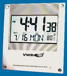 Digital clock has 92 mm (3⁵/₈") high digits for visibility from 7.6 m (25') away, and is accurate to ¹/₁₀₀₀₀ of a second., Radio signal from NIST in Colorado automatically adjusts clock to precise time, daylight savings, leap year, and leap seconds (earth rotation wobble corrections)., 02_BulletPoint: Traceable® | Display shows AM/PM or 24-hour time, month, date, day, temperature, and humidity | Adjusts automatically for daylight savings, leap year, and leap seconds | Temperature range: 0 to 45 °C (32 to 113 °F); resolution: 0.1° | Relative Humidity range: 20 to 90%; resolution: 1%, 08_Certifications: An individually-numbered Traceable® Certificate provided with each unit, assures accuracy from an ISO/IEC 17025:2005 (1750.01) calibration laboratory accredited by A2LA. It indicates traceability of measurements to the SI units through NIST or other recognized national measurement institutes (NMI) that are signatories to the CIPM Mutual Recognition Agreement., 10_Ordering: Supplied Traceable® Certificate, wall mount, and batteries., Final SAP Desc Link: 6904348, SAP Description Status: Ready, Digital clock has 92 mm (3⁵/₈") high digits for visibility from 7.6 m (25') away, and is accurate to ¹/₁₀₀₀₀ of a second., Radio signal from NIST in Colorado automatically adjusts clock to precise time, daylight savings, leap year, and leap seconds (earth rotation wobble corrections)., 02_BulletPoint: Traceable® | Display shows AM/PM or 24-hour time, month, date, day, temperature, and humidity | Adjusts automatically for daylight savings, leap year, and leap seconds | Temperature range: 0 to 45 °C (32 to 113 °F); resolution: 0.1° | Relative Humidity range: 20 to 90%; resolution: 1%, 08_Certifications: An individually-numbered Traceable® Certificate provided with each unit, assures accuracy from an ISO/IEC 17025:2005 (1750.01) calibration laboratory accredited by A2LA. It indicates traceability of measurements to the SI units through NIST or other recognized national measurement institutes (NMI) that are signatories to the CIPM Mutual Recognition Agreement., 10_Ordering: Supplied Traceable® Certificate, wall mount, and batteries., VWR® digital radio atomic clock, Cat. No.: 47732-424, W×H×D: 8.8×8.8×0.9", Weight: 1.125 lbs., Final SAP Desc Link: 6904348, SAP Description Status: Ready