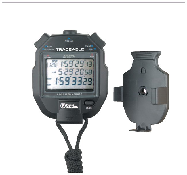 Unit recalls 300 memories and displays sample numbers 1 through 300. Fisherbrand Traceable 300-Memory Stopwatch provides repeat functions of countdown alarm timing and can recall memories both during and after event timing.