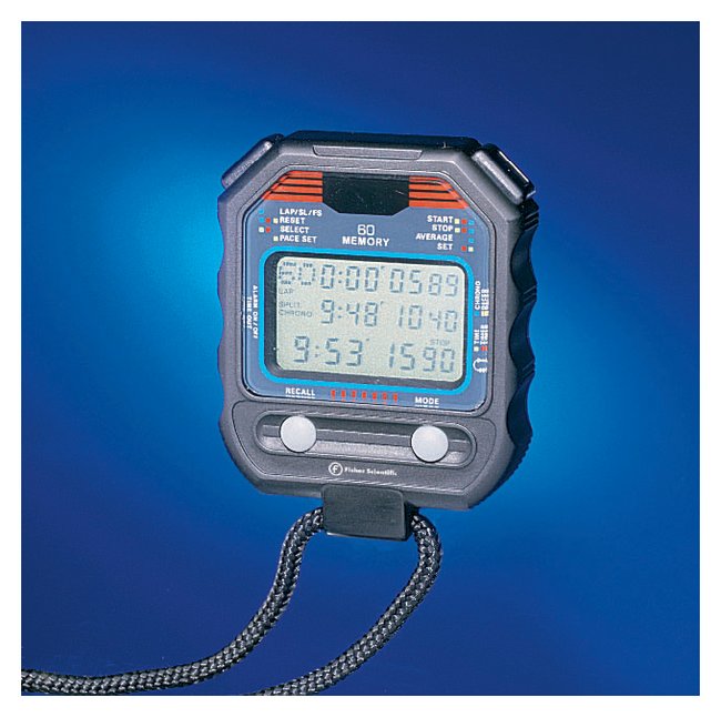 Provides repeat functions of countdown alarm timing. Fisherbrand Traceable 60-Memory Stopwatch has three-line display which simultaneously shows running time, cumulative split, and interval split.