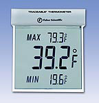 Can be attached to the outside of a window to view outdoor temperatures. Fisher Scientific™ Traceable™ Big-Digit See-Thru Thermometers have transparent display with 1.25 in. (32cm) high digits which shows current and minimum/maximum temperatures. Use outdoors, in storerooms, fume hoods, labs, cleanrooms, refrigerators, and plant areas.Window mount, wall mountAutomatically clears and updates the min./max. readings dailyAccuracy: ±1°CResolution: 0.1°Order InfoDimensions: 3.5 × 4.25 × 0.75 in. (8.9 × 10.8 × 1.9cm)Weight: 8 oz. (226.7g)CertificationsIndividually serial-numbered Traceable Certificate is provided from an ISO 17025 calibration laboratory accredited by A2LA™; indicates traceability to standards provided by NIST™.