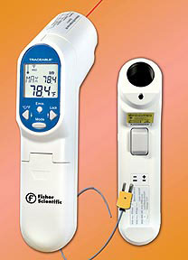 Simple operation—point at sample and take a reading in less than a second. Fisher Scientific™ Traceable™ Infrared Thermometer with Trigger Grip instantly reads both Fahrenheit and Celsius for any surface, including solids, semisolids, and liquids.Noninvasive, no-touch measurements are ideal for food preparation, life sciences, pharmaceuticals, petroleum products, cleanrooms, electronics, and field useThermocouple jack may be used for reading all Type K thermocouplesMinimum/maximum feature permits viewing highest and lowest readings at any timeDisplays the average of all readings made and the difference between two readingsAudible, user settable, high and low alarms signal out-of-range conditions“Hold” function freezes display at the current readingBacklighting permits viewing in low-light conditions; low-battery indicatorMemory permits recalling individually captured temperaturesCertificationsIndividually serial-numbered Traceable Certificate is provided from an ISO 17025 calibration laboratory accredited by A2LA™; indicates traceability to standards provided by NIST™.