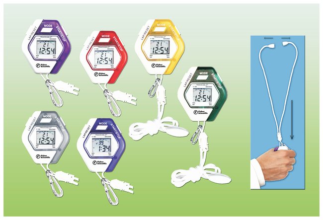 Digital stopwatches with choice of six translucent colors—color code to a specific test or instrument. Fisherbrand Traceable Kaleidoscope Stopwatch displays time of day in hour, minute, and second, AM/PM, date, and day of the week.