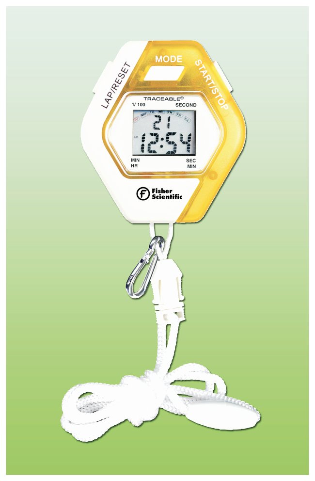 Digital stopwatches with choice of six translucent colors—color code to a specific test or instrument. Fisherbrand Traceable Kaleidoscope Stopwatch displays time of day in hour, minute, and second, AM/PM, date, and day of the week.