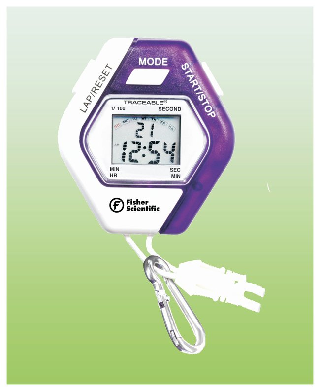 Digital stopwatches with choice of six translucent colors—color code to a specific test or instrument. Fisherbrand Traceable Kaleidoscope Stopwatch displays time of day in hour, minute, and second, AM/PM, date, and day of the week.