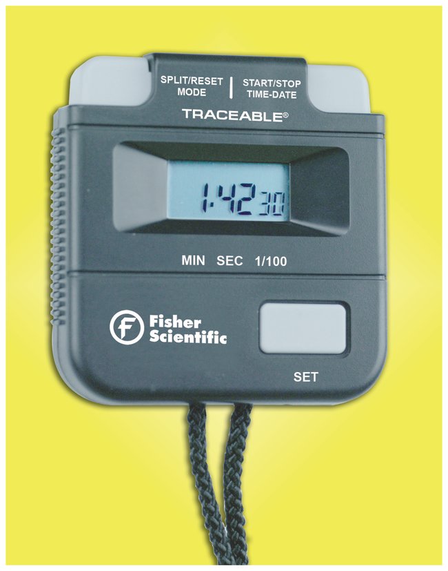 Times to 59 minutes, 59 seconds, 99 hundredths. Fisherbrand Traceable One-Hour Digital Stopwatch acts like a chronograph and displays time of day to the second, AM/PM, and the date. With single-action, time in/time out, cumulative split and continuous timing.