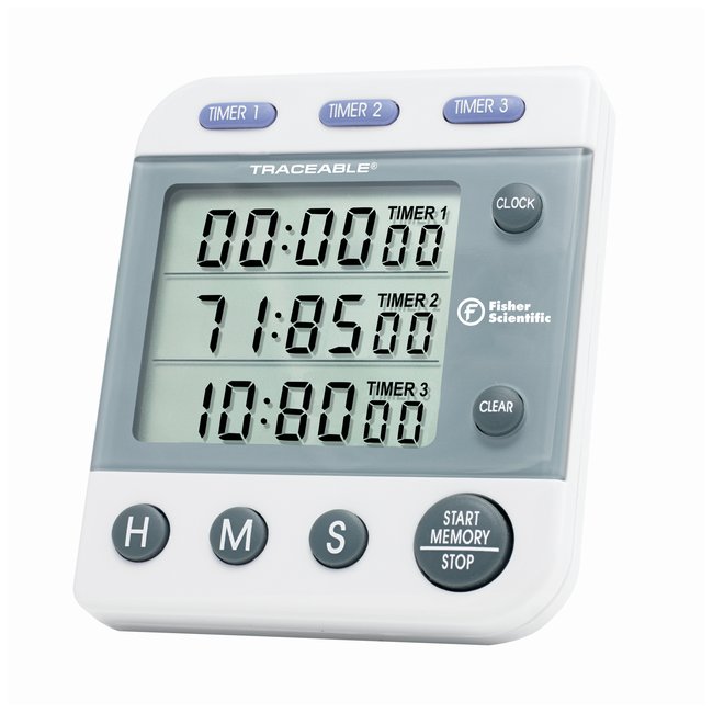 The Fisher Scientific™ Traceable™ Three-Line Alarm Timer is a user-friendly timer that displays three different countdown/alarm times simultaneously. Three unique channels may be started individually or concurrently and programmed to count down from 99 hours, 59 minutes, 59 seconds to 1 second. When zero is reached, an alarm sounds, TIME's UP is displayed, and the timer begins counting up. It's the perfect unit to dedicate to a group of repetitive tests.Memories return the display to the previously programmed timeMay also be used as three stopwatches or in any combination of up/down timingDisplay has a time-of-day clockQuartz-crystal timing accuracy is 0.01%Digits are 3/8 in. highChemical-resistant ABS plastic case size: 2 x 3.25 x 0.5 in.Weight: 3 oz.CertificationsTo assure accuracy, an individually serial-numbered Traceable™ Certificate is provided from our ISO/IEC 17025 calibration lab accredited by A2LA. It includes traceability to standards provided by NIST
