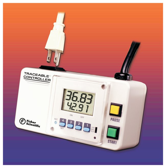 Use for timed shutdown or repeated ON/OFF timing.0.5 in. high (1.3cm) red LCD display indicates ON/OFF status of equipment Internal NiCd battery protects programs against power outagesAccuracy: 0.01%Manual pause switch overrides program without disturbing it, and permits equipment to be instantly turned offIntuitive operation permits setting a program in <5 secondsHigh-impact ABS caseTurn-off ControllerCounts up and turns any piece of equipment off at the end of a set time periodProgrammable in three interval settings: 0.01 to 99.99 seconds, 1 to 99 minutes, 1 to 99 hours Repeat Turn-on/Turn-off ControllerCounts up and turns any piece of equipment on for a programmed time and off for a different programmed timeRepeat feature automatically continues cycling on and off programmed times until manually stoppedProgrammable for separate on and off timing periods in three interval settings: 1 to 99 seconds; 1 to 99 minutes; 1 to 99 hoursOrder InfoDimensions: 6L × 2.75W × 3.25 in. H (15.2 × 7 × 8.3cm); Weight: 12 oz. (340.2g)CertificationsIndividually serial-numbered Traceable Certificate is provided from an ISO 17025 calibration laboratory accredited by A2LA™. It indicates traceability to standards provided by NIST™.