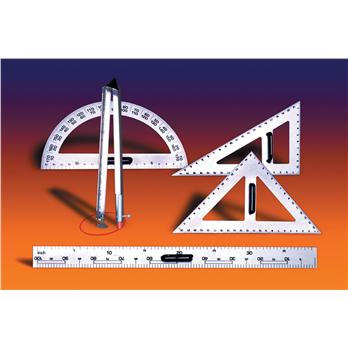 Durable, lightweight plastic instruments, designed for whiteboards/chalkboards. Triangles, protractor, and ruler are made of white polystyrene and feature handles for ease of use. Compass is made of clear acrylic, and accomodates most dry erase and magic markers. Triangle, 45 degree, 23 " base, 16 " sides.