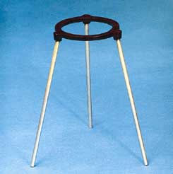 Cast Iron Tripod^ Single ring tripod. Flanged to accept concentric rings. Mounted on detachable steel legs for storage. OD: 152mm.